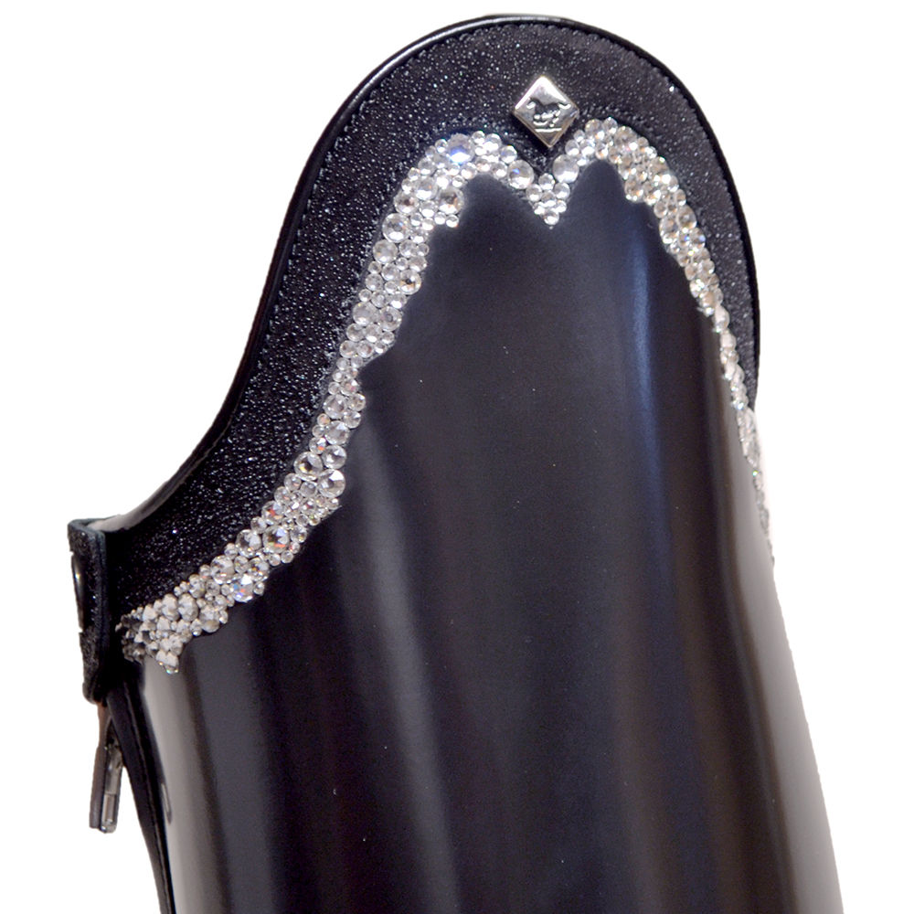 This Particular Bellini De Niro Boot features a Brushed Black Leg and foot. With Vitello Black inside Leg. Featuring a G9 Rondine Top in Stardust Black, completed with a GGL83 Crystal row under top band. All boots come with Vibram Soles. This design features the Black Vibram sole. All price are not including any additional spur rests that may be shown on images. These can be added on the boot builder. The Bellini Boot is available in multiple colours and a selection of choice of tops. You can customise the top of the boots with leather tops and add any additional extras on the boot builder. The Bellini Boot is a rigid Dressage boot.