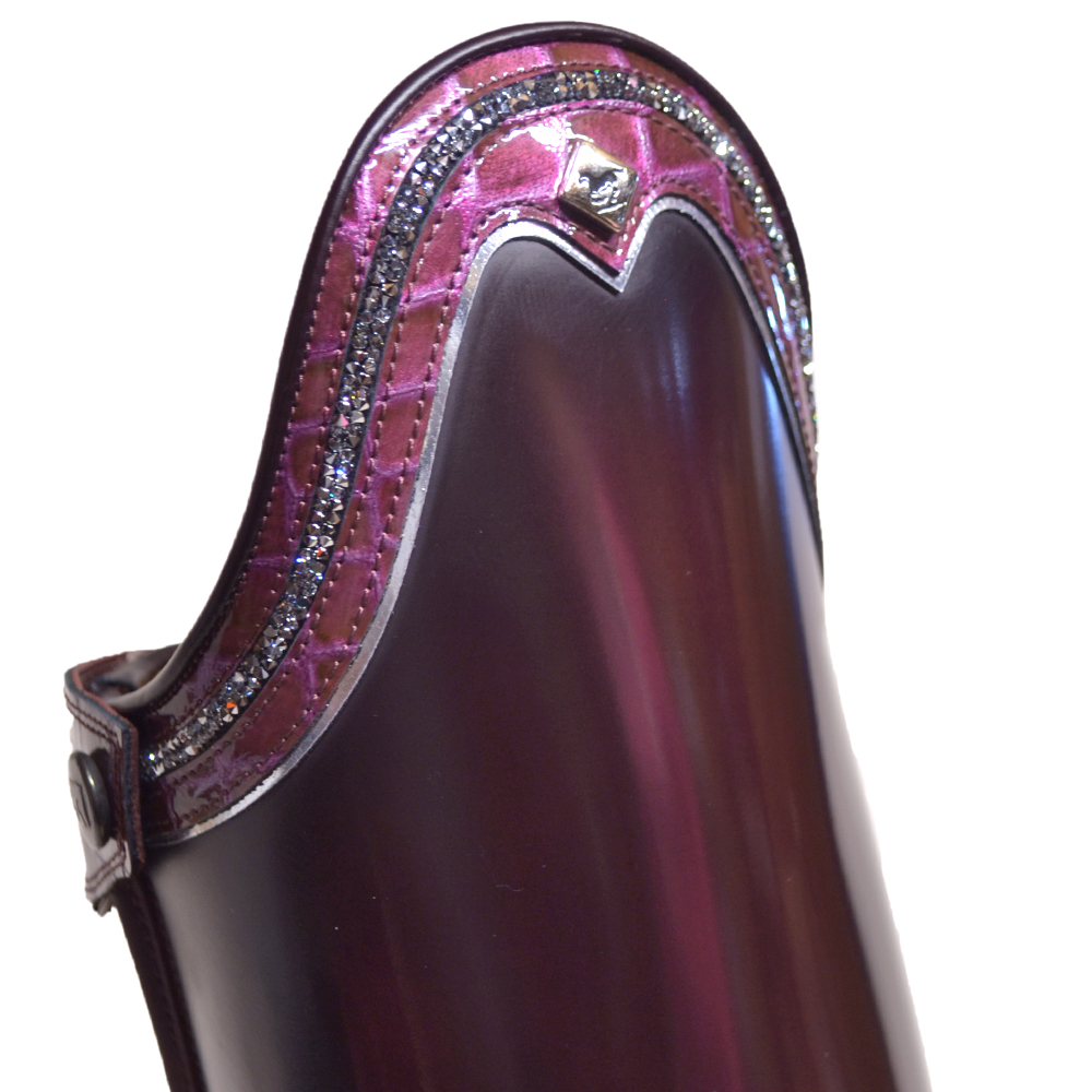 This Particular Bellini De Niro Boot features a Brushed Bordo Leg and foot. With Vitello Musto inside Leg. Featuring a G9 Rondine Top in Lucidi Amaranto, completed with a GGs73 Rock Crystal row and specchio silver trim under top and over toe cap. All boots come with Vibram Soles. This design features the Brown Vibram sole. All price are not including any additional spur rests that may be shown on images. These can be added on the boot builder. The Bellini Boot is available in multiple colours and a selection of choice of tops. You can customise the top of the boots with leather tops and add any additional extras on the boot builder. The Bellini Boot is a rigid Dressage boot.