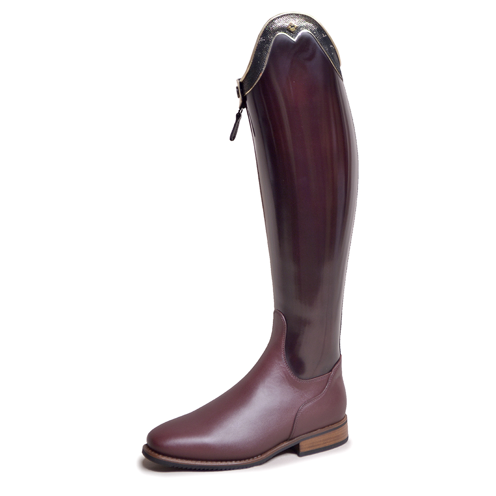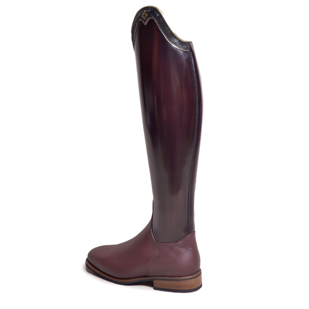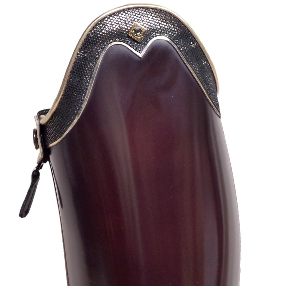 This Particular Bellini De Niro Boot features a Brushed Bordo leg and Vitello Bordo inside leg and foot section. Featuring a G9 Rondine Top in Incanto Bronzo. Luxury gold trims over top and under top. An offset front zipper. All boots come with Vibram Soles. This design features the brown Vibram sole. All price are not including any additional spur rests that may be shown on images. These can be added on the boot builder. The Bellini Boot is available in multiple colours and a selection of choice of tops. You can customise the top of the boots with leather tops and add any additional extras on the boot builder. The Bellini Boot is a rigid Dressage boot.