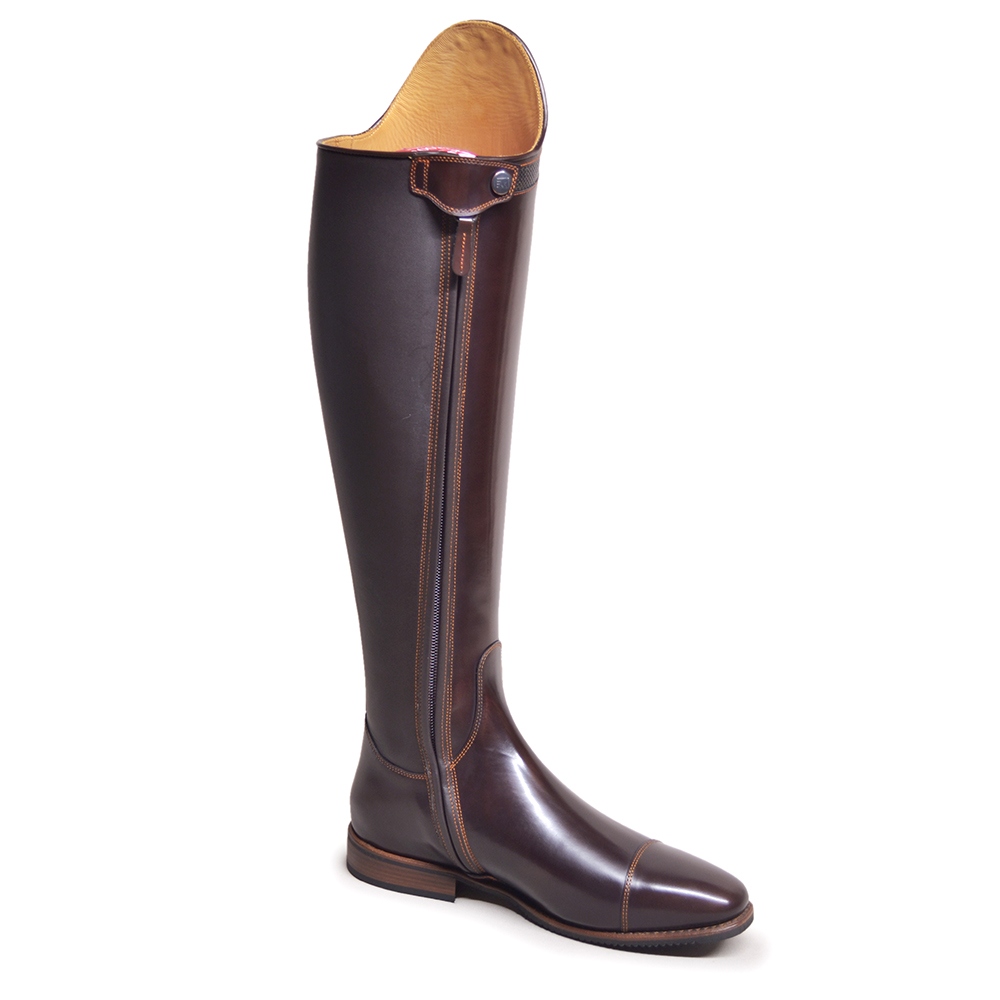 This Particular Bellini De Niro Boot features a Brushed Brown Leg and Foot. Featuring a G24 Rondine Top in Intreccio Brown and a copper stitching. The Bellini model features a Soft Vitello leather inside leg section. All boots come with vibram sole. This design features the Brown Vibram sole. All price are not including any additional spur rests that may be shown on images. These can be added on the boot builder. The Bellini Boot is available in multiple colours and a selection of choice of tops. You can customise the top of the boots with leather tops and add any additional extras on the boot builder. The Bellini Boot is a rigid Dressage boot, with an offset front zipper.