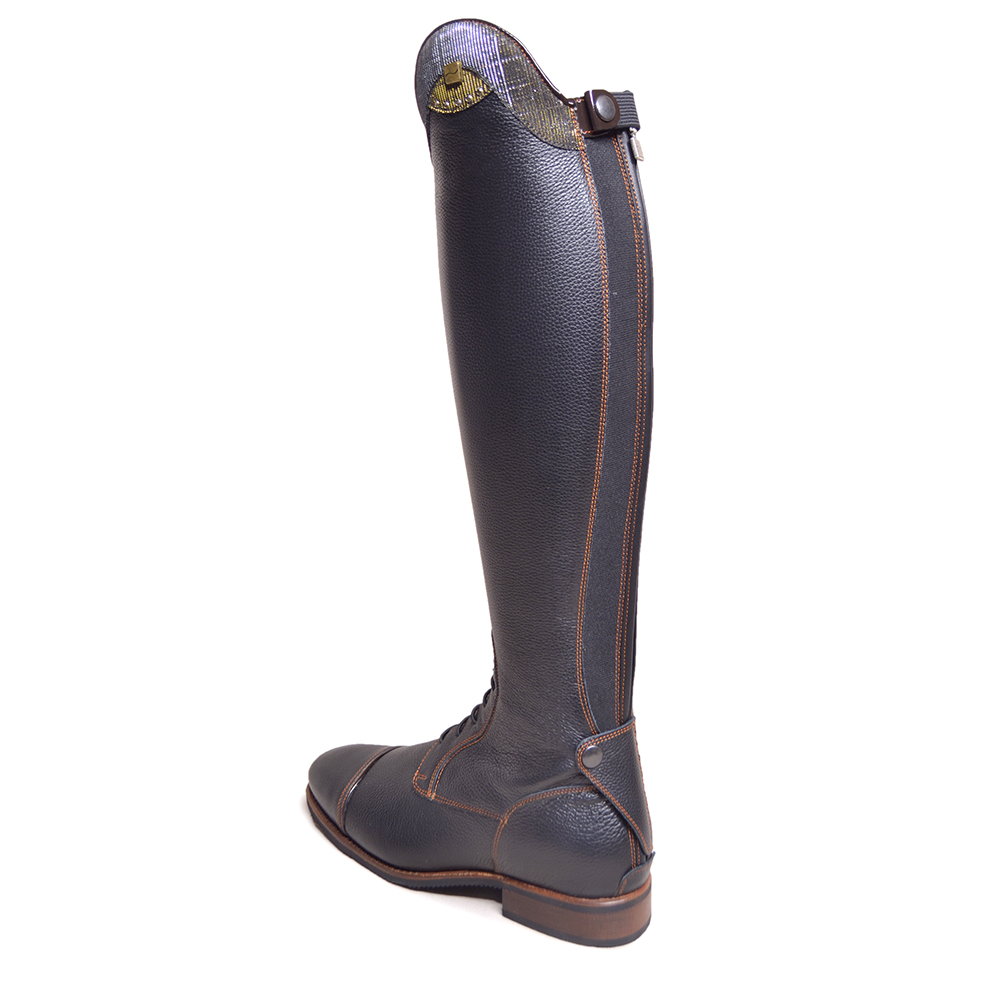 This Particular DonaDeo Julia Black Iride Grey a very soft Quick Black calf skin leather with Iride Grey top and copper swarovski crystals. The boot is trimmed in black Patent with copper stitching. The boot also has a subtle elastic panel down the back next to the zip, which aids comfort and give. All boots come with a Vibram Sole, available with or without laces. Donadeo Adult range boots are available in 3 colours, Black Brown and Blue.